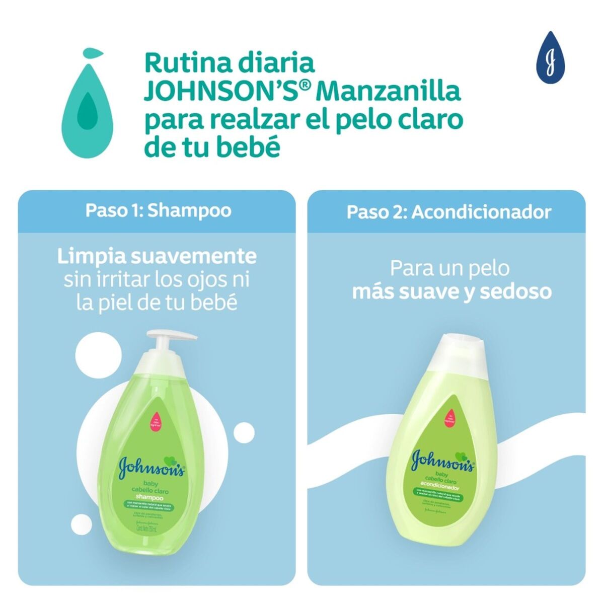 Shampoo JOHNSON’S® Manzanilla posee manzanilla natural, que ayuda a realzar el color del pelo claro. Limpia suavemente y protege el pelo y cuero cabelludo del bebé. Desarrollado con ingredientes de origen natural. Tiene pH fisiológico, es hipoalergénico y libre de colorantes, parabenos, sulfatos y ftalatos.