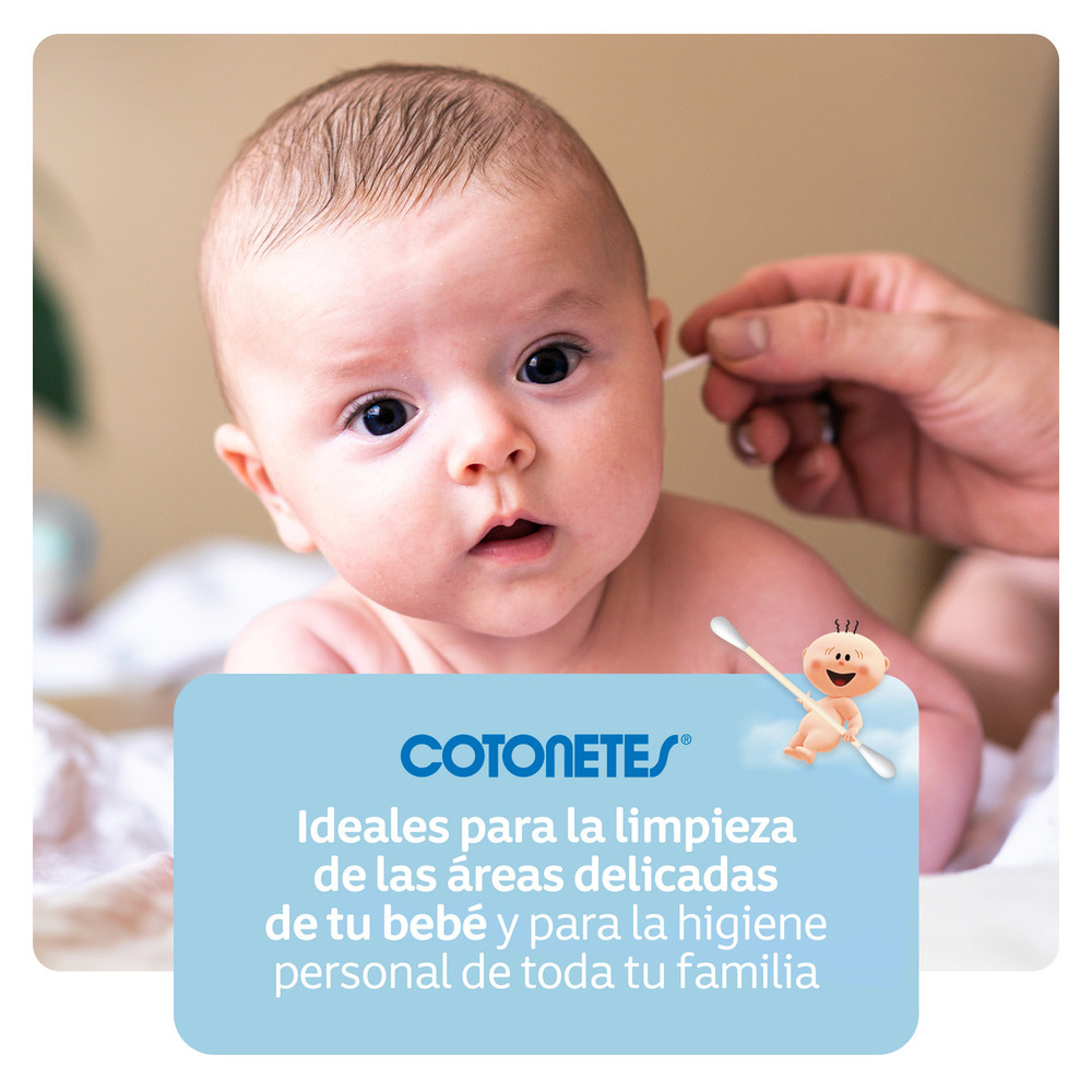 COTONETES® son hechos con algodón 100% natural para mayor suavidad y absorción. Son seguros, suaves y absorbentes. Empaque de bolsa y papel 100% reciclables, suaves para el planeta. Sus puntas resistentes de algodón no desprenden fibras y son indicados para la higiene personal de toda la familia.